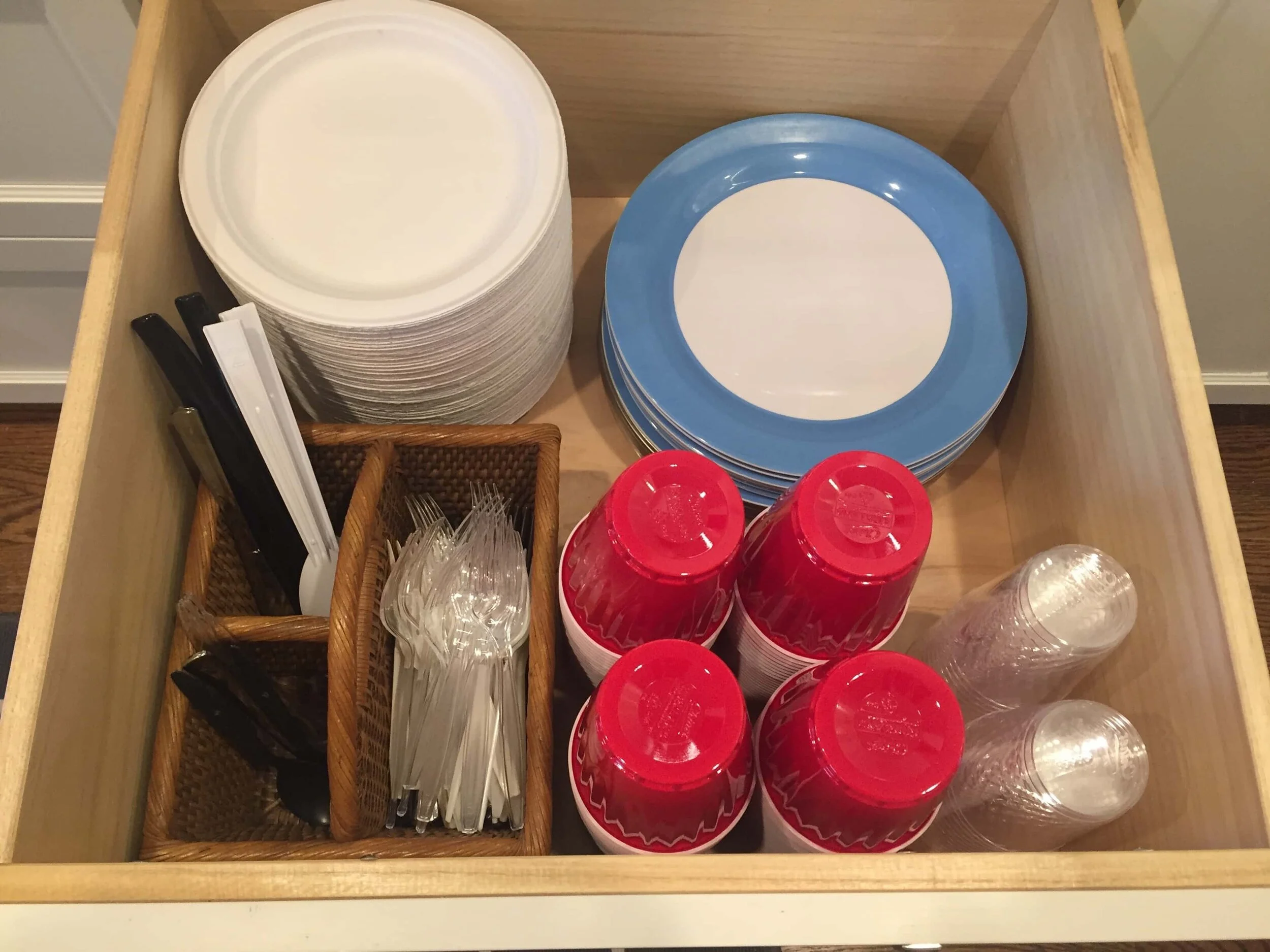 Gather your paper or plastic plates, cups and utensils together and store in a drawer or shelf. Put the utensils in a divided caddy that you can easily pull out when hosting your next BBQ.